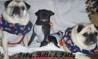 27 years ago our love of pugs started, and we have been pugless for only 2 short periods of time after the passing of 2 at seperate times. We urrently share our home with 3 pugs, Toby, Belle and Polly, A golden retreiver, Shelly (all have been rescue dogs) and 2 cats, Bobby and Sally.